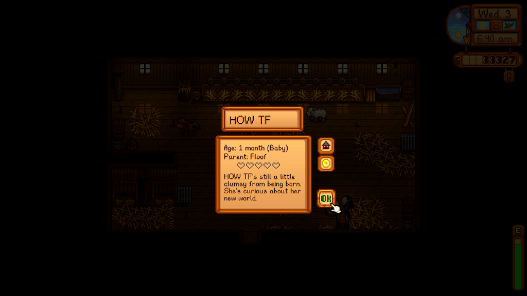 Animal life is out of control at the farm. I finally have a horse (named Bojack), and riding him around is so much quicker than walking. My animals are spontaneously conceiving babies and a witch flew by, casting a spell to give me a void egg. Throw that thing in the incubator and you’ve got a void chicken! I’ve been naming my miracle animals appropriately:
