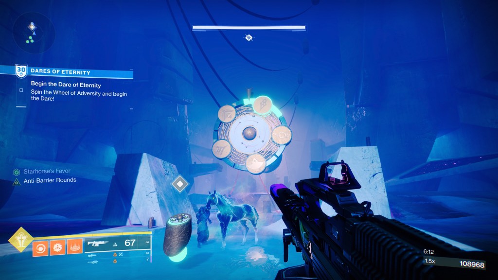 The other new game mode introduced in this update is the Dares of Eternity offensive activity. Xur and his space horse are hosting a game show with randomized rounds of objectives separated only by wacky obstacles courses.