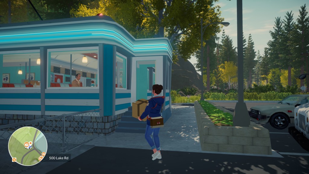 You spend your days driving around town delivering mail and packages. Nosey Meredith will occasionally comment on people’s mail in between crushingly-long cutscenes of bland conversation with random townspeople. It’s riveting stuff, especially when you look deep into the eyes of each character and see how full of life they all are. They’re reacting to environments and acting like real people. Even the background characters have been thoughtfully cultivated.