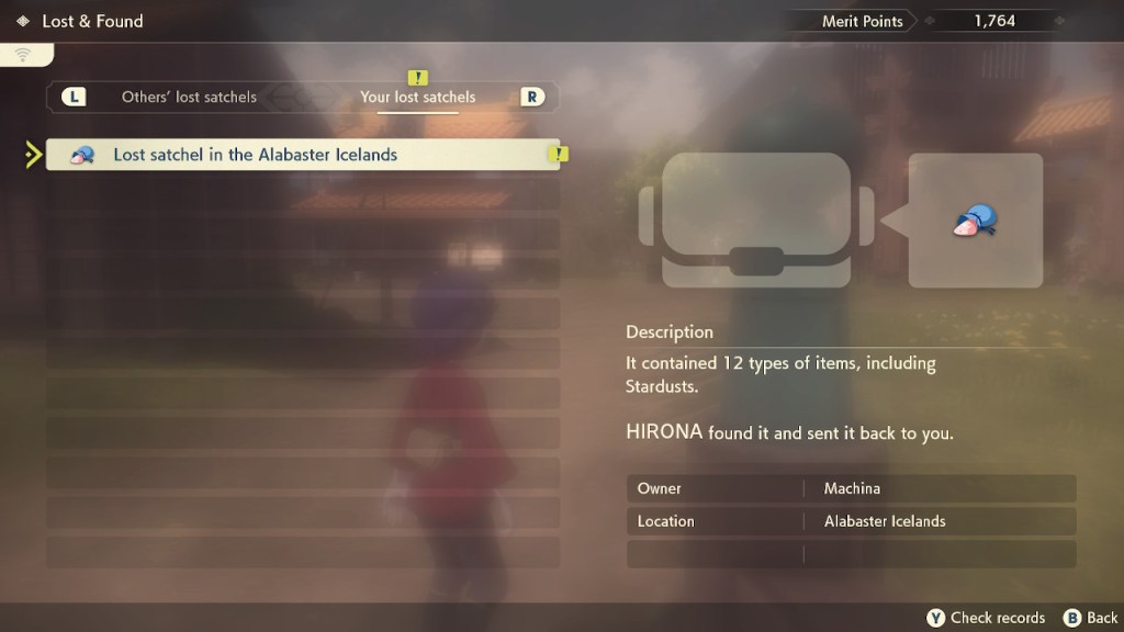 There may inevitably come a time where you black out in the world. While you will be rescued, you will lose items that you cannot recover on your own. Luckily, if you connect your game to the Internet, a good samaritan can find your satchel and mail it back to you. You are incentivized to find and return items to other players because you’ll receive a reward plus Merit Points (MPs) which can be spent at a special vendor. The vendor who accepts MPs can be found in Jubilife Village and she sells special items you won’t readily find elsewhere. Thanks for finding my stuff, Hirona!