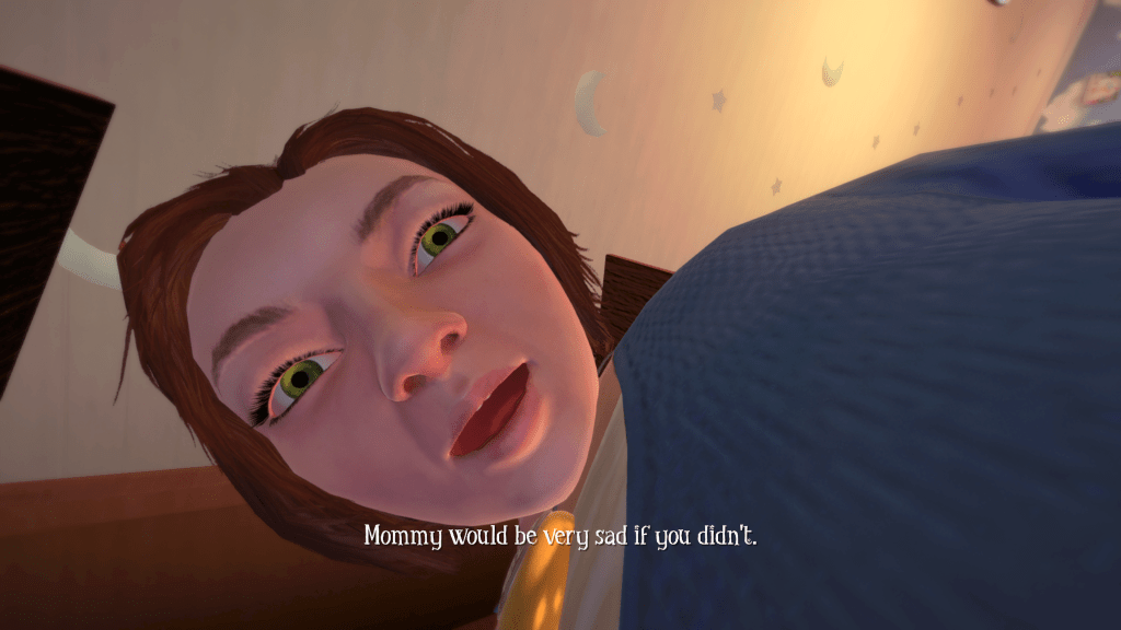 I jest! The game is creepy enough without introducing paranormal elements. When your crib is flipped over and your teddy goes missing, you start your journey wandering the dark corridors of the house. I immediately flashed back to memories as a kid getting up at night and how scary it felt. A trip to the bathroom felt perilous, and this game does a great job of recreating that fear while inserting the legitimate things I was afraid would happen in those dark halls.