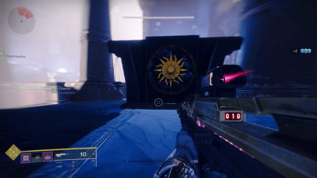 Okay, buckle up because it gets complicated. So, you’ve got the same mechanics of gathering the essence and depositing it. There will be two at a time. Find the two symbols that are lit up in the middle of the room and go to the corresponding ledge around the outside of the room. Teleport to the nightmare realm and you’ll be right next to the psion you need to kill to acquire the essence. This room is nuts. There are enemies EVERYWHERE and you will get blown up and off the map. While we did the same formula of one person clearing the bell while the other two grabbed the symbols, I did accidentally discover that one person can pick up both without any issue. Observe!