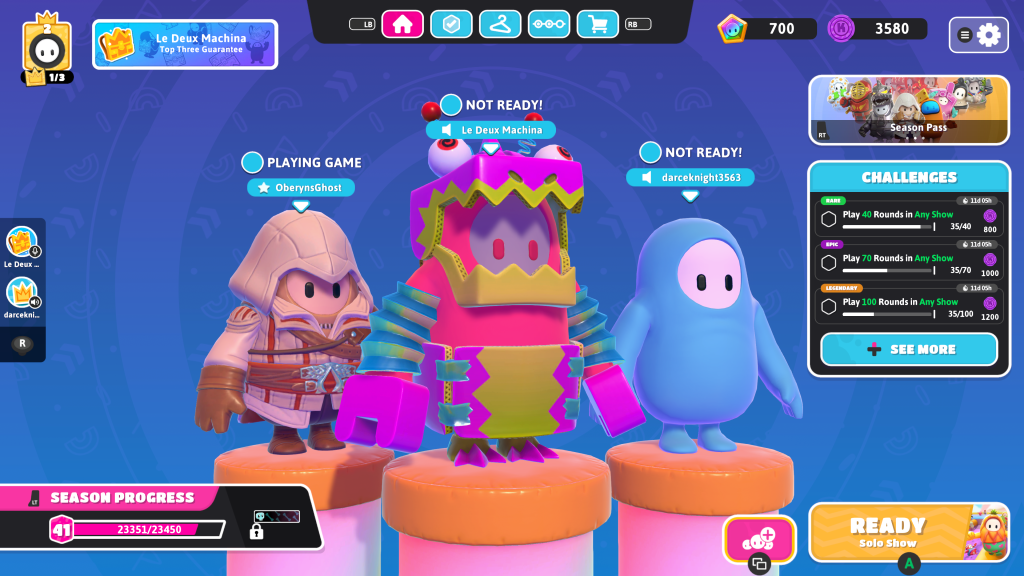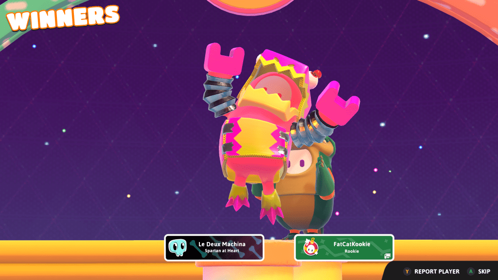 Fall Guys also super appeals to my desire to have cute outfits. I am obsessed with my cardboard monster outfit I got. There’s so many ways to customize your character and it obviously makes no difference in terms of how well you play, but it is something I love. I didn’t get any outfit to begin with because I wasn’t sure how I’d feel about it, but I quickly fell in love with the game and bought myself the costume. Don’t be surprised if I end up with lots of others.