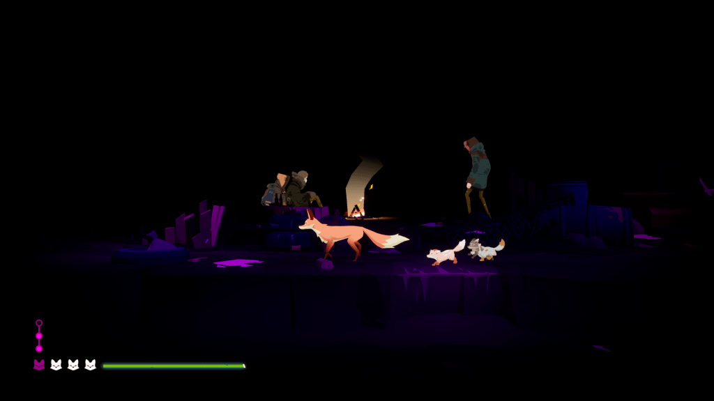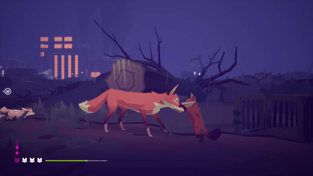 This game has several competing challenges that you have to balance. As a mother fox, you’re responsible for taking care of your babies, guiding them and finding food while you try to avoid the encroaching presence of people. The game starts innocently enough with you getting to change the patterns of the babies’ fur and fawn over their cute sleeping faces. Even though you are minding your own business, trouble shows up at your doorstep (literally) and snatches a baby right from your den. Things become more complicated as you have competing interests: trying to find your missing baby, looking for food for your other babies, and making sure you get back to the den before the sun rises.
