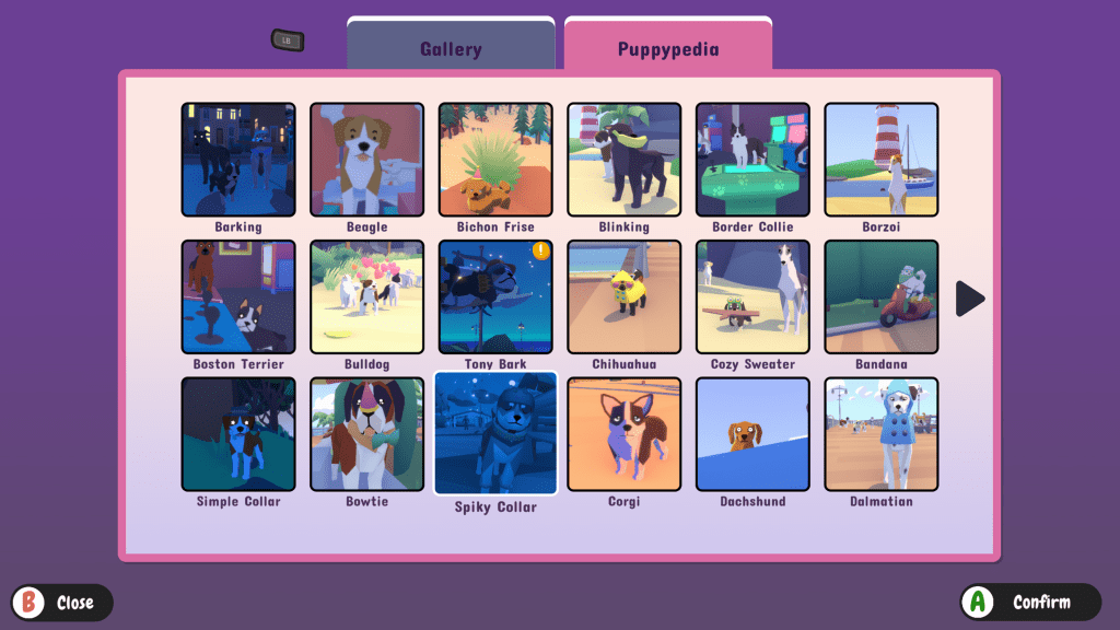 The game has a wide variety of breeds in all sorts of colors. They all have different expressions and behaviors too. I’m partial to the bullys and the dalmatians. You can see a full list of what breeds make an appearance in the Puppypedia, and you’ll want to get a picture of all of them if you want to finish it.