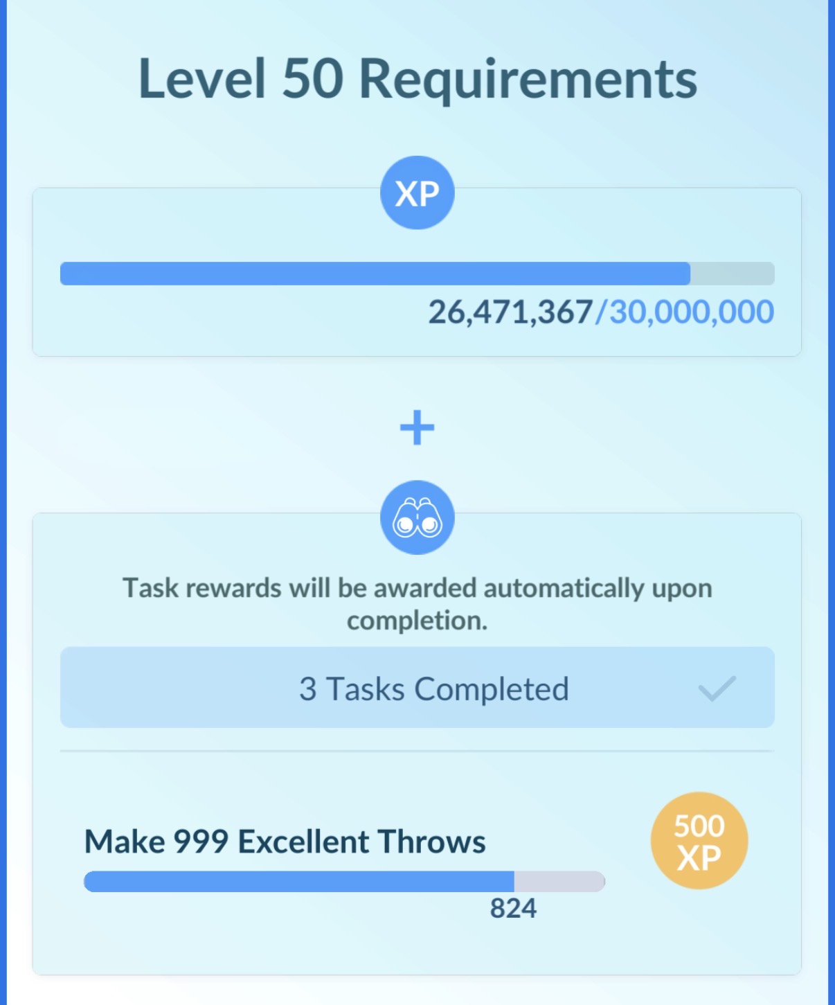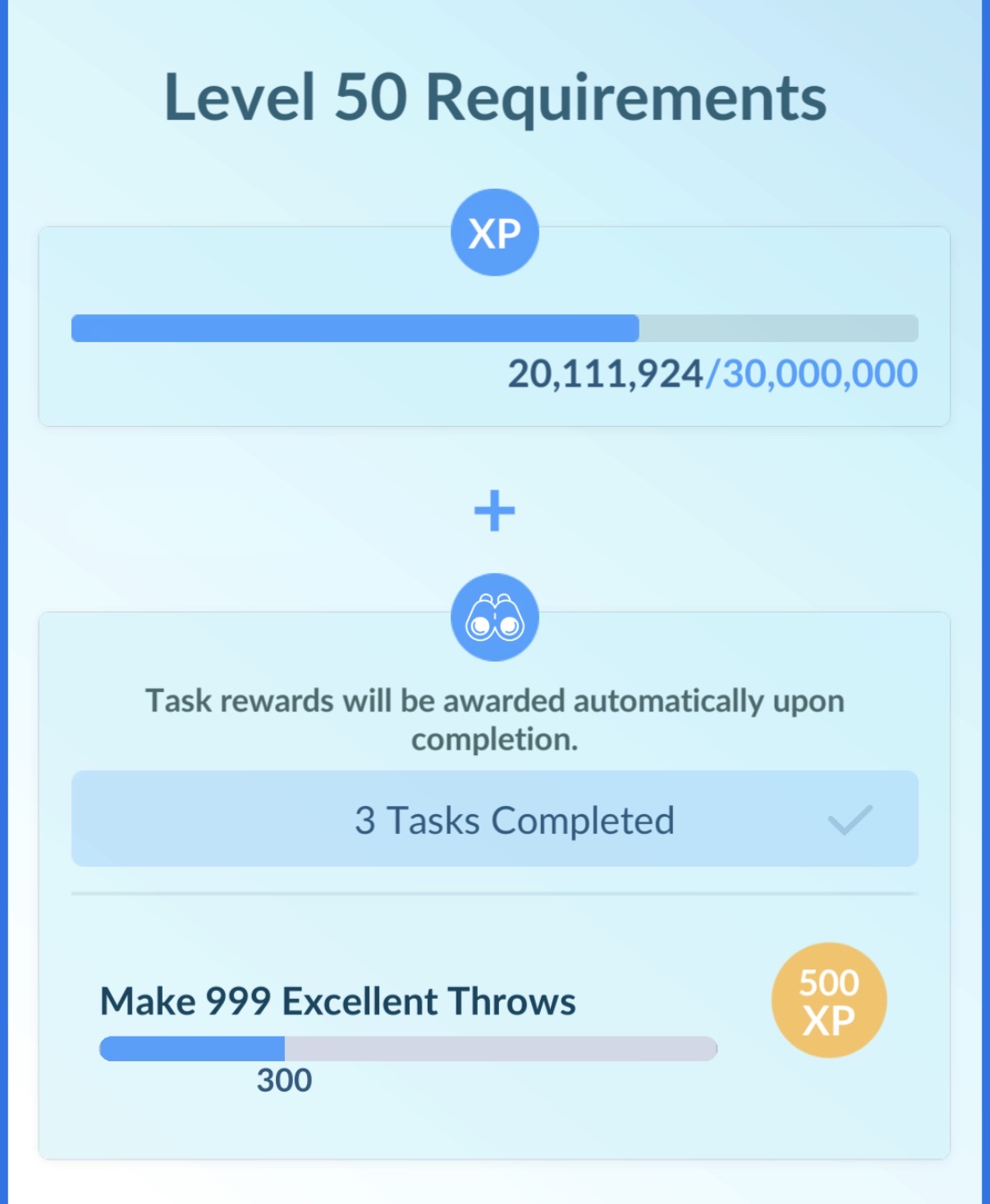 So, catching 5 legendary/mythical pokemon? Easy. I had a meltan box, popped it and finished that immediately. Getting level 10 in the battle league? Easier than it seems. Each card is five battles before you get your rewards. One win in each round gets you a level. The annoying thing is just finishing a card. Even if you get more than one win per card, you only get 1 level. That’s at least 50 trainer battles. Annoying, but doable! Also, the achievement didn’t show any progress on it. It just cleared from my list once I hit level 10. Team Rocket leaders? I thought that would be harder. But I had a lot of gyarados that I leveled up, gave double attacks to, and with some trial and error, I finished it quickly. Excellent throws were going to be the problem, but I actually started to get the hang of it. As you can see, three of the tasks were completed pretty quickly.